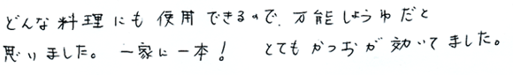 このお醤油は、香り豊かな味わいのあるお醤油です。納豆や、 すり大根、とうふ、 たまごごはん等に直接かけてご使用ください。特に納豆との相性は最高ですよ!!